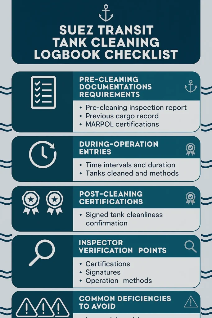 Suez Canal Authority inspectors board vessels at anchorage to verify tank cleaning compliance. They examine logbooks for completeness, consistency, and evidence of proper MARPOL adherence throughout your voyage preparation.